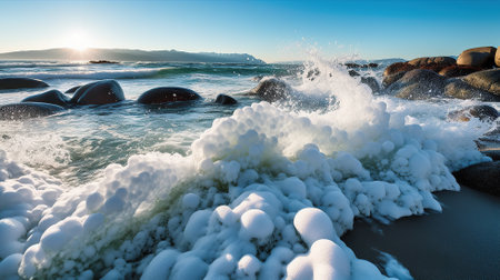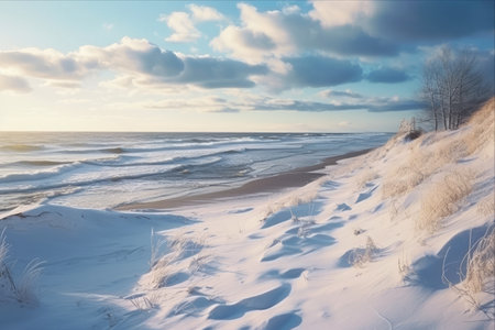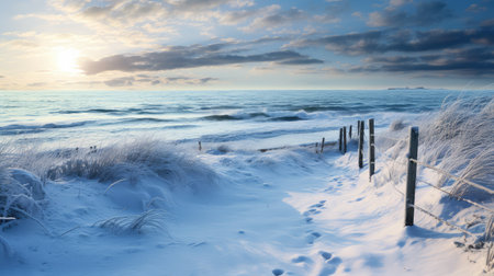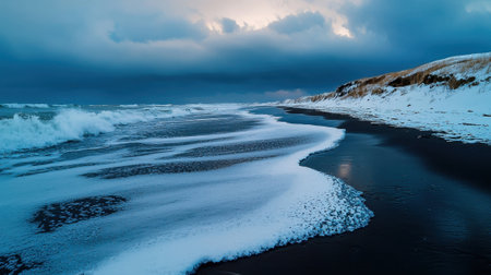 AI Generated. A pristine beach in winter where soft white snow contrasts with the dark blue ocean waves creating a stark and beautiful landscape