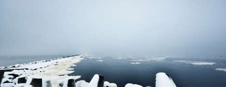 Snow-covered breakwaters and ice fragments close-up, frozen Baltic sea in the background. Thick white fog in winter. Climate change, global warming concepts