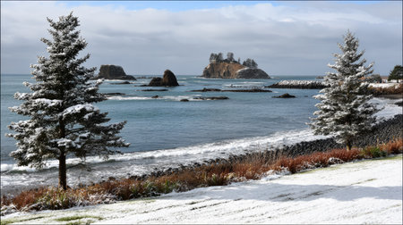 This scenic image showcases a coastal landscape with snow-covered rocks and evergreen trees. The scene is bathed in cool tones, featuring clear skies and calm water. It is a visually appealing scene, likely suitable for editorial or commercial projects related to nature, travel, or seasonal themes.