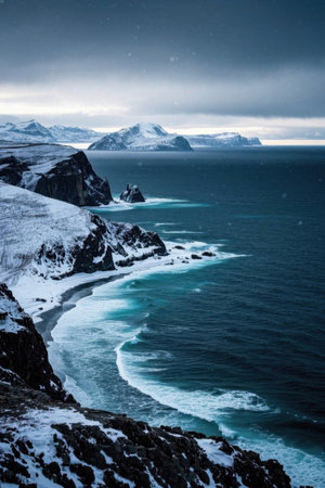Foggy Nordic Seascape Moody Minimalist Coastline With Snow, Cliffs, and Icy Ocean Waves