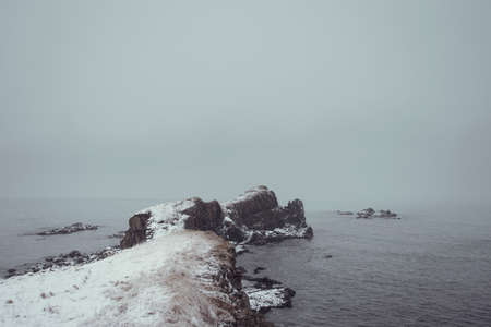 Snowy coastal cliffs with icy formations along a foggy seascape. Concept of winter landscape, nature, cold weather, seashore tranquility.