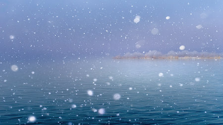 Experience the enchanting beauty of a serene winter landscape showcasing soft snowfall over calm waters at dusk, creating a tranquil and picturesque scene.