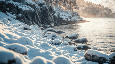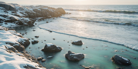 A picturesque winter scene featuring a rugged shoreline with snow-covered rocks and gentle waves. The soft morning light enhances the serene atmosphere.