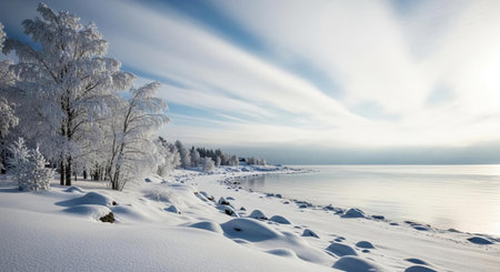 A picturesque snowy beach scene featuring a tranquil and expansive body of water in the background, creating a serene atmosphere