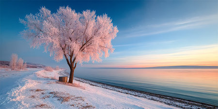Majestic Frosty Tree and Serene Snowy Seashore with Soft Sunrise Colors in a Winter Wonderland