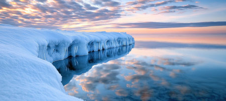 Snowy cliff overlooking a tranquil ocean at a pastel sunset