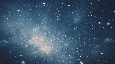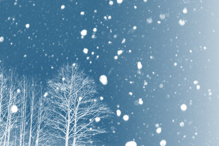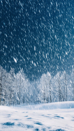 Photography captures dense snowfall against a rich navy night sky, showcasing high contrast and crisp white flakes, evoking a tranquil winter ambiance with copy space