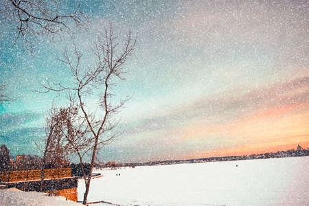 As the sun sets on a winter evening, delicate snowflakes cascade softly from the sky, creating a magical atmosphere. The tranquil hues of dusk blend beautifully with the falling snow.