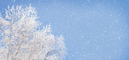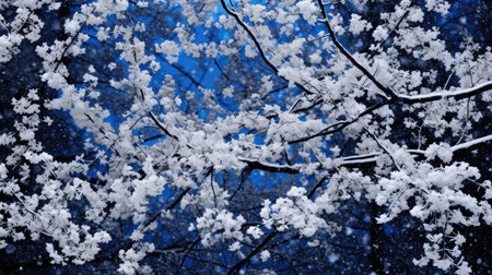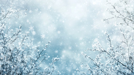 A serene winter landscape featuring snow-covered branches against a clear blue sky, perfect for seasonal or holiday designs