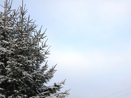 Snow-covered branches in a winter forest, with room for copy in the sky above