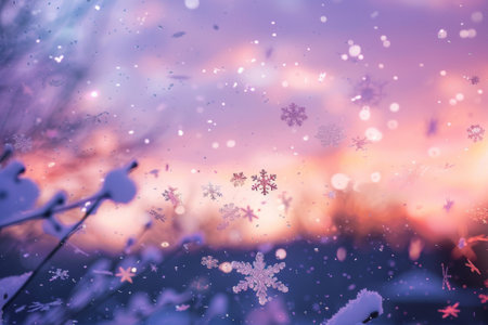 A winter sunrise over snow covered landscape, sparkling snowflakes