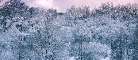 Christmas sunset landscape covered with white snow. Wonderful winter forest. New Year Christmas atmosphere. Festive and enchanting winter wonderland. Snowflakes, snowdrifts and hills. AI generated.