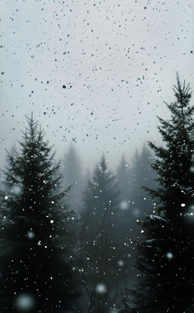 Snowflakes descend gently among tall evergreen trees in a misty forest, creating a tranquil winter scene in the early morning hours.