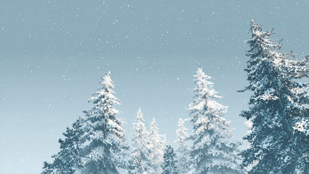 A Serene Winter Wonderland Scene with Snowflakes Gently Falling Against a Soft Blue Sky Background