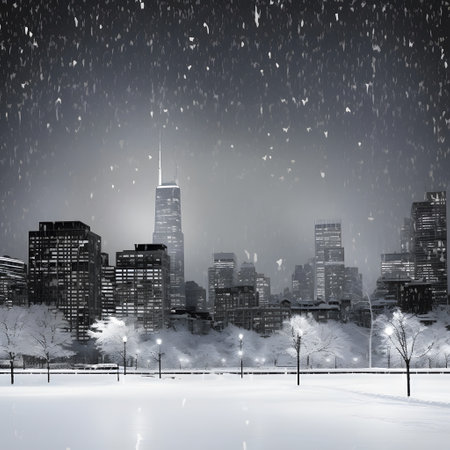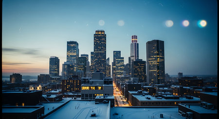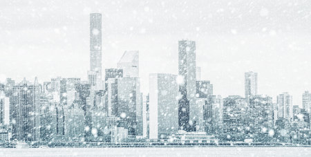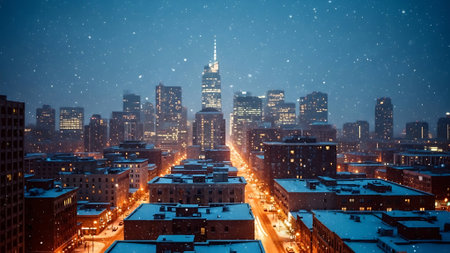 A serene winter night scene showcasing a bustling city skyline enveloped in soft falling snow, highlighting modern skyscrapers under a tranquil blue sky.