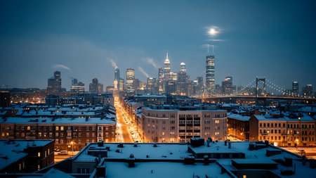 New York City skyline at night. Buildings and streets covered with snow.