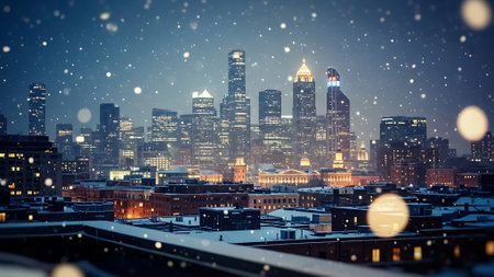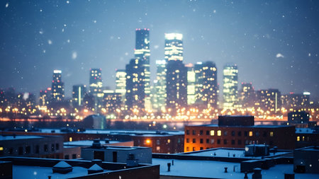 Cityscape at night with snowflakes and bokeh effect