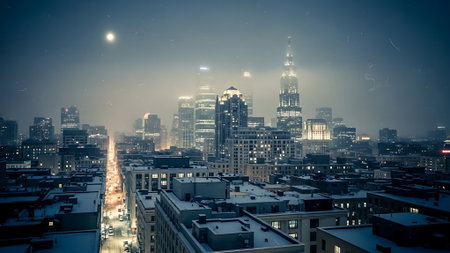 Panoramic view of Philadelphia skyline at night with snowfall.