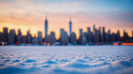 Snow covered ground in focus, blurred cityscape, urban skyline silhouette in background, colorful sunrise or sunset, winter city scene, no people