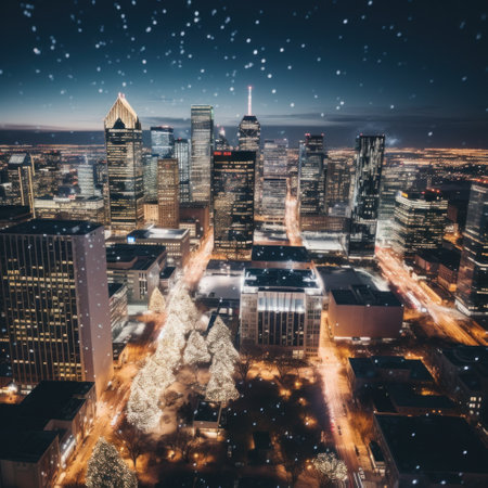 A stunning aerial view of a city skyline lit up with twinkling lights and holiday decor