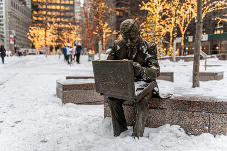 NEW YORK-JANUARY 4: The bronze businessman statue “Double Check†during the snow on January 4 2018 near Wall Street in lower Manhattan.
