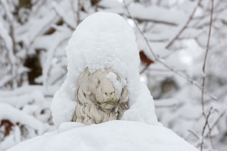Park sculpture of a lion covered with snow