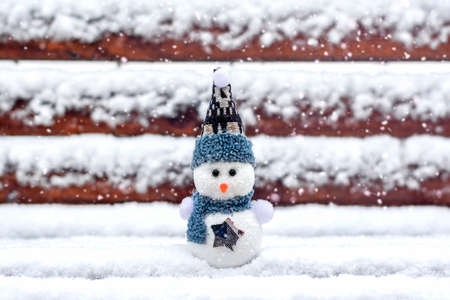 Merry christmas and happy new year greeting card with copy space Happy little snowman in red cap and scarf standing in winter snow background Xmas fairytale Hello January, February concept