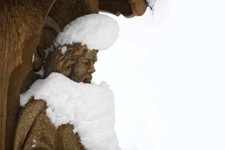 A detailed carving of Jesus Christ is blanketed in snow, creating a serene and peaceful scene
