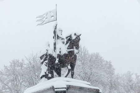 Winter scene with trees and sculpture of tsar Samuel in the park, covered with snow, Sofia, Bulgaria