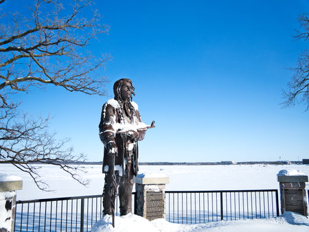 BEMIDJI, MN - 9 FEB 2019: Statue of Chief Bemidji, local historic Ojibwe leader, stands in snow adjacent to frozen Lake Bemidji with fish hoses in winter scene.