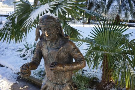 Sukhumi, Abkhazia-January 27, 2017: Urban landscape with sculpture on the background of snow and palm trees.