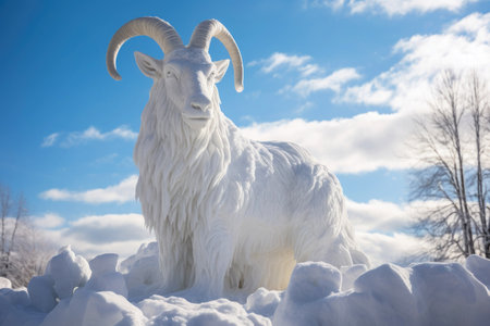 An AI-generated illustration of a white goat made out of snow in a peaceful winter landscape