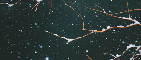 Winter landscape featuring snowflakes falling on bare tree branches against a dark background