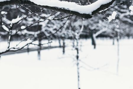 Beautiful Winter Abstract Bokeh with Snowy Tree Branches and Soft Blurred Landscape Background