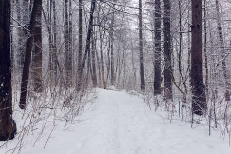 Path at a snowbound winter forest. Beautiful winter landscape.
