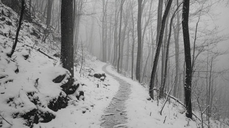 A peaceful winter pathway winds through a dense, foggy forest, where bare trees stand covered in soft snow, creating a serene atmosphere for nature lovers.