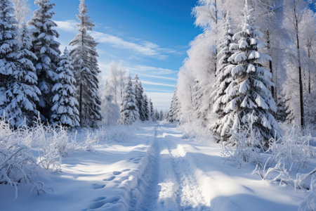 Tranquil snow-covered forest path with sunlight filtering through pine trees. That the image is generated using AI.