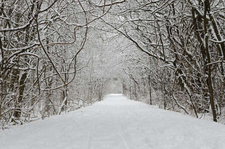Pathway through the snow-covered forest hills after a blizzard. Natural tunnel. Atmospheric landscape. Winter wonderland. Climate change, natural, environmental conservation, ecology. Europe