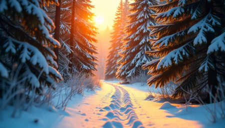 A winding path through a winter wonderland showcases snow-laden trees as the sun sets behind distant mountains. The peaceful ambiance invites exploration and tranquility.