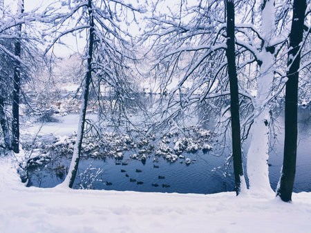 River with ducks and trees covered with snow in winter landscape.