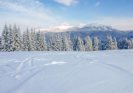 Beautiful winter landscape with snow covered fir trees and mountains in the background