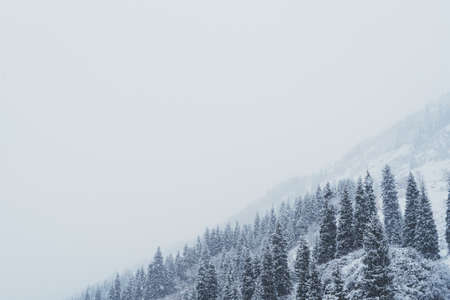 Christmas background with snowy fir trees and heavy snowfall. Winter mountains landscape