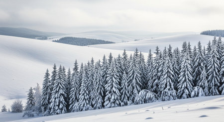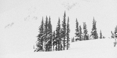 Monochrome winter landscape showing the tops of snow covered fir trees against a stark white sky. A peaceful and serene natural scene with a minimalist aesthetic.