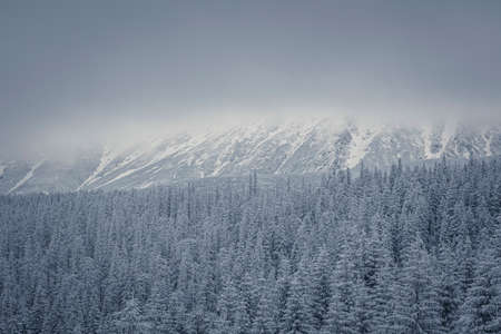 Dense cloudscape over High Tatra Mountain Peaks, Poland. Dark December day in Zakopane area. Fir forest in a valley. Selective focus on coniferous trees, blurred background.