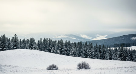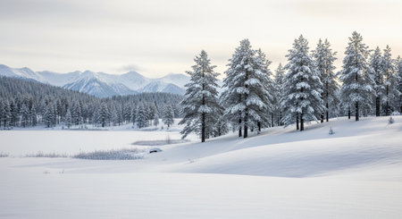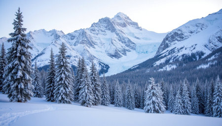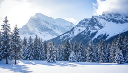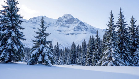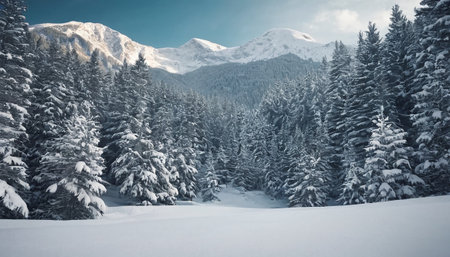 A breathtaking winter scene with snow-covered mountains and a forest of fir trees. The scene evokes a sense of tranquility and peace.