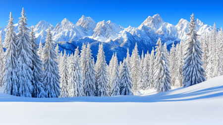 Winter mountains panorama with snow covered fir trees and blue sky.