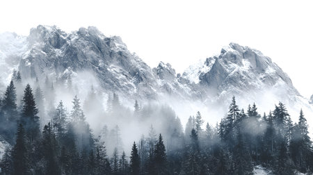 Majestic snow-covered mountain range with evergreen trees and fog-covered peaks