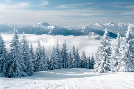 Mountain landscape with snow covered fir trees and blue sky with clouds