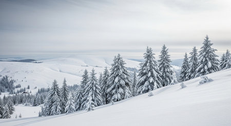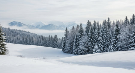 Evergreen trees blanketed in snow create a serene winter landscape, with misty mountains rising in the background, evoking tranquility and natural beauty