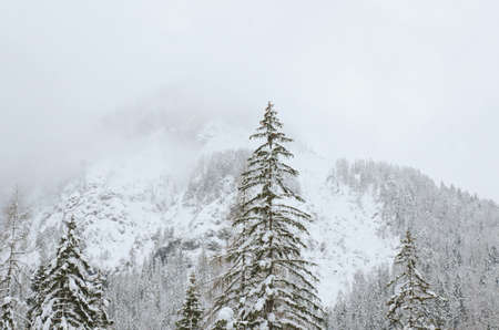 Winter landscape with snowy mountain with coniferous forest and pointy pinnacle with trees on top in haze. Atmospheric alpine scenery with firs on hillside. Spruces on snow mountain and sharp rocks.